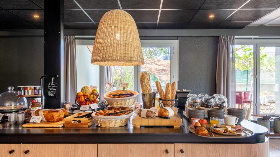 Il ristorante dell’hotel accoglie i suoi ospiti anche a pranzo e cena. Il menù mette in evidenza una cucina francese tradizionale, arricchita da piatti di stagione e specialità regionali. È possibile optare per un menù fisso o comporre il proprio pasto à la carte. La sala, sobria e accogliente, si apre su una terrazza che aggiunge un tocco di aria e luce all’esperienza, specialmente durante la bella stagione.